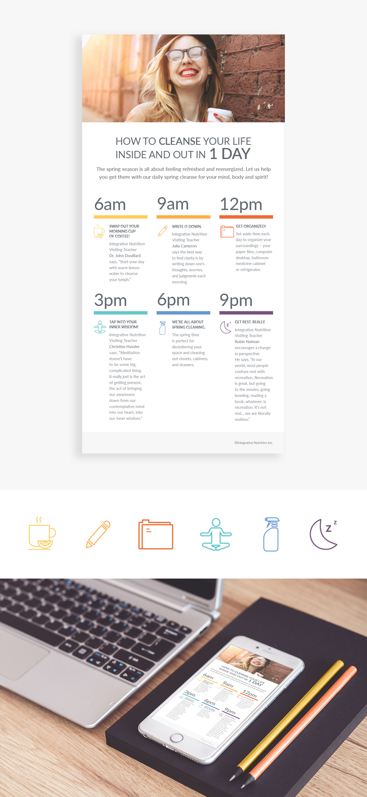 The Institute for Integrative Nutrition desired to create a set of icons and infographics illustrating how to cleanse one's life inside and out within a single day. Role: Illustrator. Produced by: Institute for Integrative Nutrition